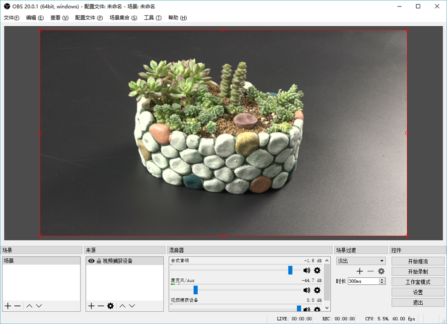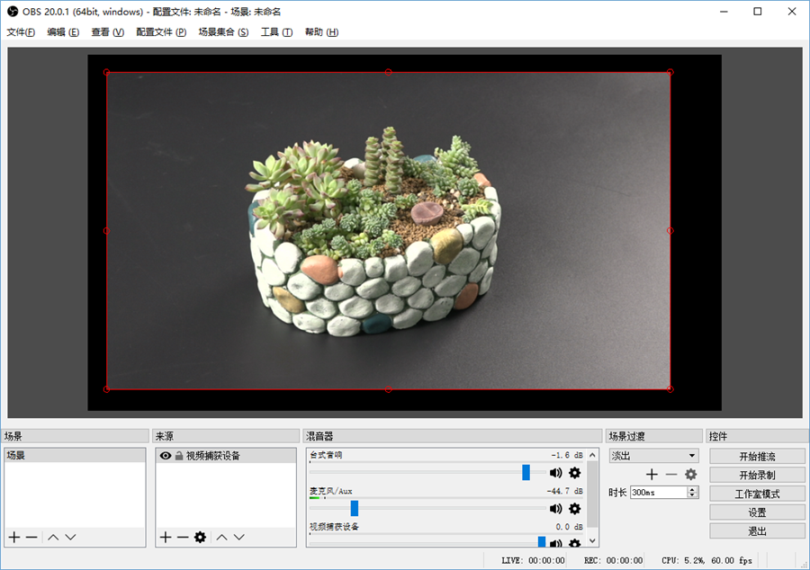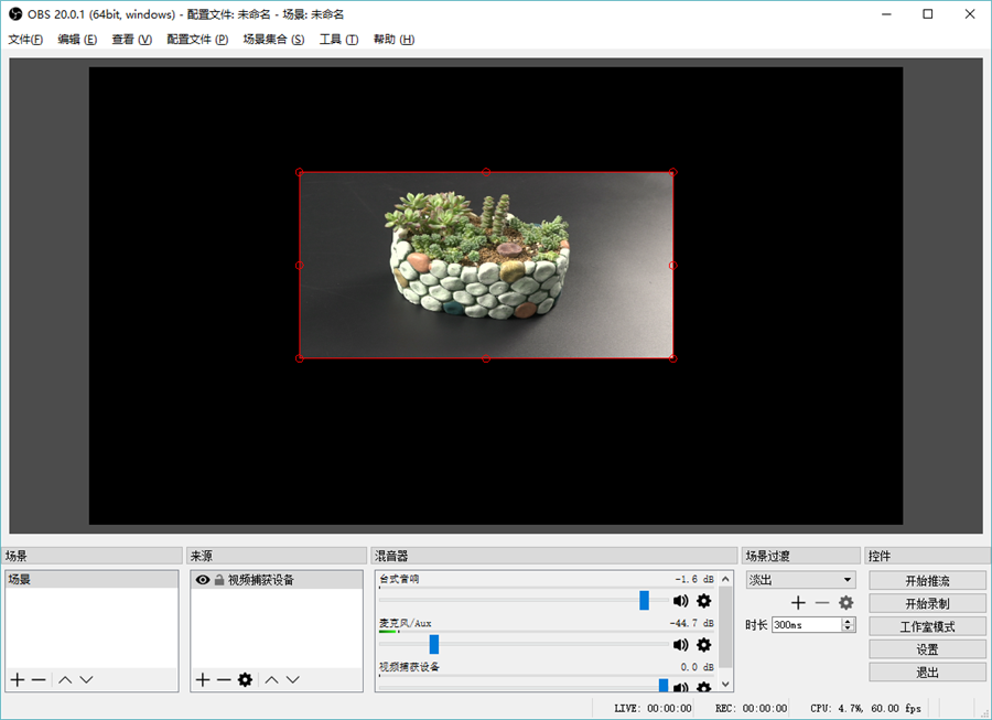 通過BU110將攝像機錄制的視頻推送到OBS視頻界面,在OBS中可以任意調整視頻的尺寸,可以全屏,也可以拉伸縮短。