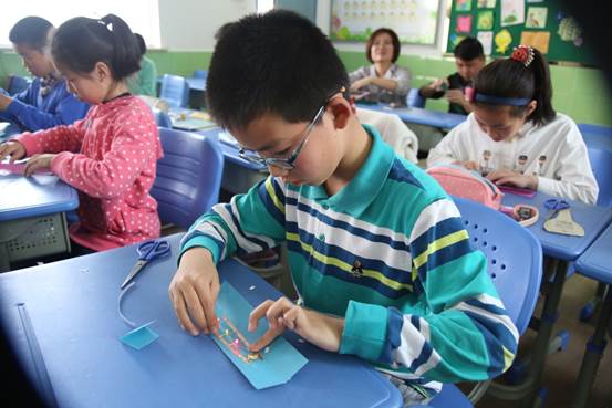 圖為“海蓮創客工坊”小朋友在制作發光的手環