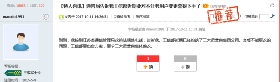 或許是接到的投訴量明顯增多,這一問題引起了工信部的重視,近日有用戶發(fā)帖稱,在進行投訴后,接到了江蘇省通信管理局政策法規(guī)處的電話,并透露出信息:工信部近期已經(jīng)約談了三大運營商集團公司,套餐不能更改的問題,工信部要出臺方案,要求三大運營商集體整改。