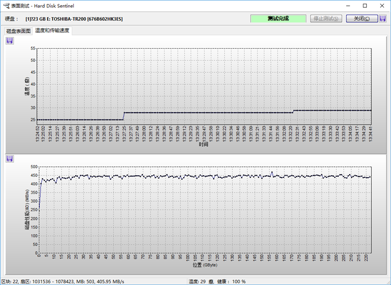 硬盤平均讀取速度為503MB/s,平均寫入速度為405.95 MB/s,溫度為29度。