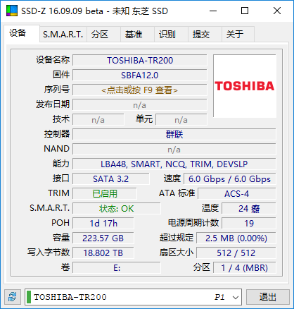 可以看到TR200使用的是TC58NC1010GSB-00主控,這顆主控芯片與東芝A100 SSD相同,是Q300 SSD主控芯片TC58NC1000GSB的升級版,已知上一代的TC58NC1000GSB主控的主要特性是四核心主控,具備八通道NAND(32CE),支持Smart ECC,Smart Flush、256-Bit AES加密、TCG Opal2.0等技術,支持SLC/MLC/TLC等顆粒。那么最新一代TC58NC1010GSB-00主控肯定有提升,到底性能會如何看后面測試數據。