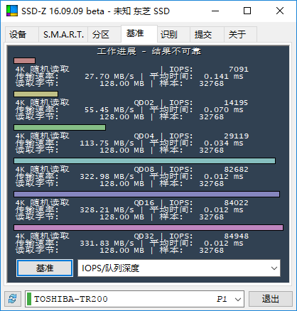 從IOPS隊列深度測試中,可以得出4K隨機讀取平均速率為325MB/s。