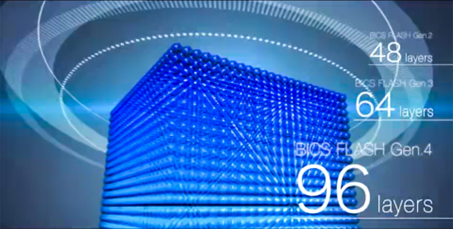 作為NAND閃存的發明人,2007年,東芝就在世界上首個宣布三維(3D)閃存堆疊技術。基于該技術,可打造出存儲容量比同類NAND技術高達三倍的存儲設備。該技術可支持在更小的空間內容納更高存儲容量,進而帶來很大的成本節約、能耗降低,以及大幅的性能提升。通過進一步開發,東芝推出了3D閃存:BiCS FLASH?。BiCS FLASH?是垂直堆棧的三維(3D)閃存,相比其前一代的先進技術,即二維(2D)NAND閃存,它具有更高的芯片面積密度。此外,BiCS FLASH通過優化電路技術和生產工藝縮小了芯片尺寸。2017年6月28日公布的96層BiCS FLASH單位面積存儲容量比之64層提升了40%。
