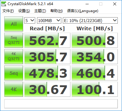 首先進行連續讀寫速率的測試,使用CrystalDiskMark軟件。