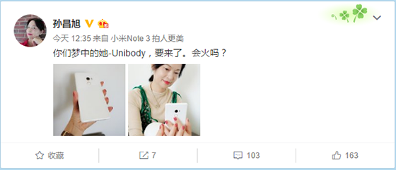大家一直期待已久的小米MIX2 Unibody款終于有消息了,今天微博博主孫昌旭,也是小米產業投資部合伙人在微博爆料說道:你們夢中的她-Unibody,要來了。會火嗎? 并且配了兩張小米MIX2 Unibody款圖片。