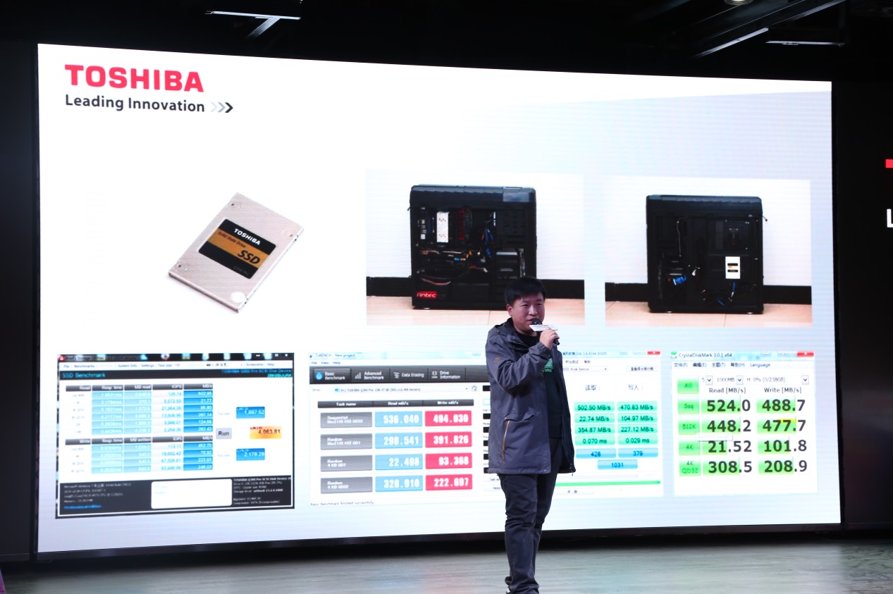 交流會正式開始,首先東芝的技術人員為大家詳細講解了東芝Q300固態硬盤、Flash Air、 TransferJet傳輸寶機器全系列存儲產品,更邀請到達人在現場與大家分享了自己在使用東芝Q300 Pro固態硬盤的新的體驗。