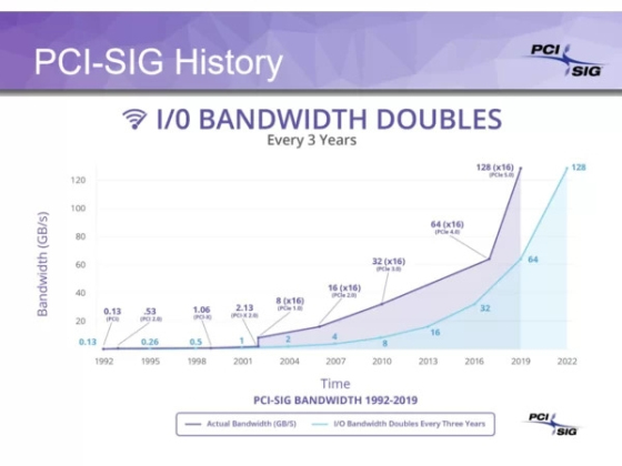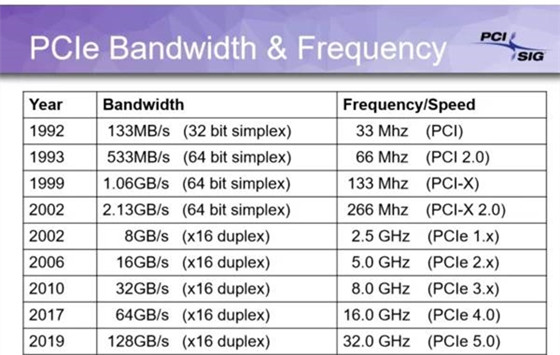 而PCIe 5.0的一些規劃也同時公布,傳輸速度和帶寬又將在PCIe 4.0的基礎上翻一倍,達到32GT/s和128GB/s。
