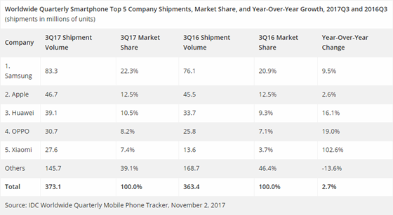 權威的全球市場調研機構IDC發布了第三季度全球智能手機市場份額的調研數據報告。在排名前五的品牌中,暫時處于統治地位的三星、蘋果毫無疑問地獲得了冠亞軍,而國產品牌:華為、OPPO、小米則分列第三到第五位。
