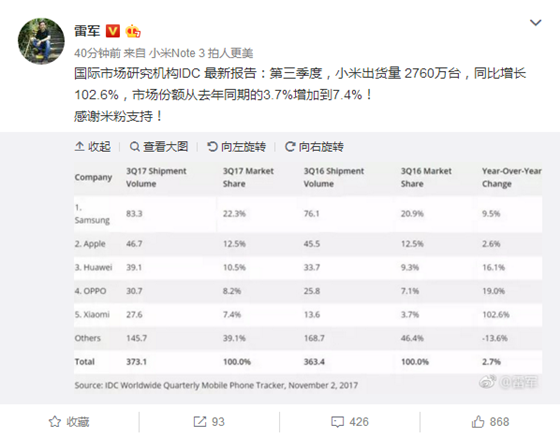 可以看出,第三季度小米的表現極其亮眼,102.6%的同比增長非常驚人,可以說是完全扭轉了去年的頹勢,爆發力不可小覷。對此,雷軍也興奮的發微博感謝米粉的支持。