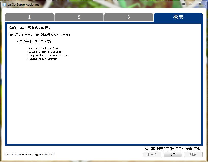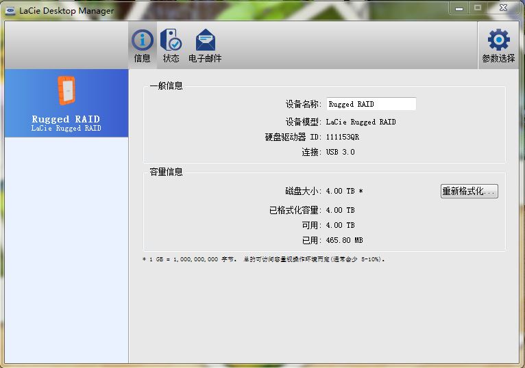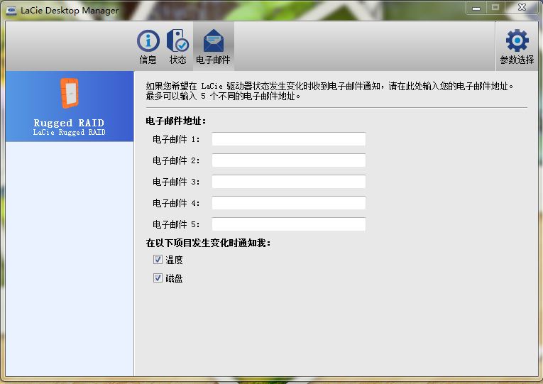 LaCie Rugged RAID作為定位于高端的存儲(chǔ)產(chǎn)品,LaCie還為其配置了軟件,在第一次使用的時(shí)候需要安裝,小編是在Windows平臺(tái)安裝了此驅(qū)動(dòng)器。該軟件主要可以查看硬盤(pán)的事實(shí)狀態(tài),如提醒是否溫度過(guò)高、工作是否正常等。