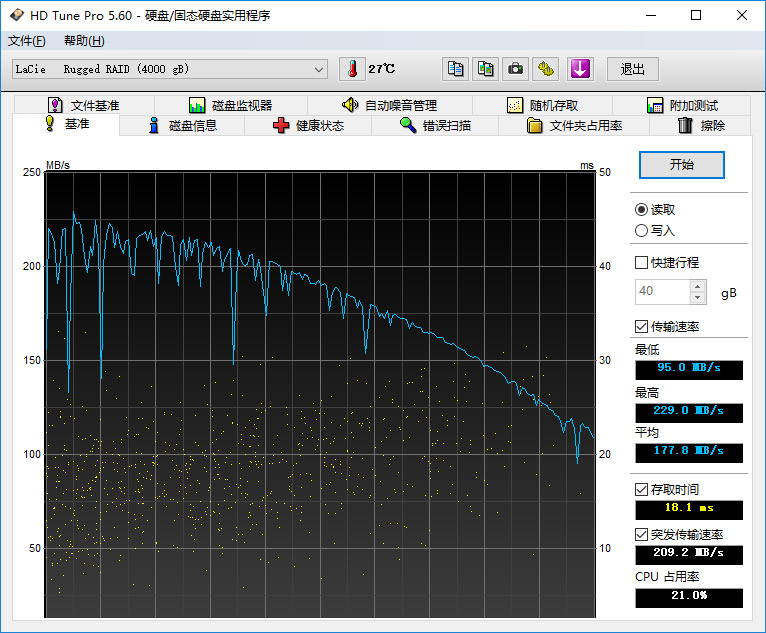 通過(guò)測(cè)試我們發(fā)現(xiàn),這款Rugged RAID的最低讀取速度為95MB/s,而最高讀取速度為229MB/s,平均速度為177.8MB/s,測(cè)試的曲線相對(duì)變化不大。