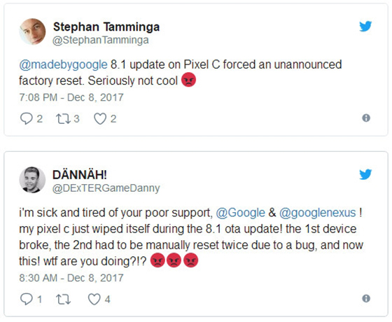 上周,谷歌正式推送了安卓8.1系統給自己的親兒子Pixel和Nexus等,萬萬沒想到的是,本來是福利與特權的推送,竟然變成一個抹除數據的兇手。根據一些推特用戶反饋,Pixel C平板在升級8.1之后竟然自動恢復出廠設置,所有的數據被清空。