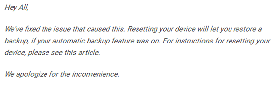 而且不管推特上有,就連Pixel C的Reddit主題頁、Nexus官方求助論壇也出現類似的報錯帖。好在目前谷歌社區管理員已經發布聲明稱,這個問題已經被修復。遇到該問題的用戶重置設備可以恢復備份,當然前提是用戶之前有開啟過自動備份功能。