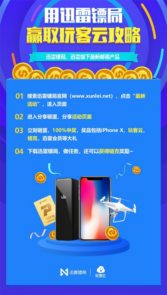 剛發(fā)布出來新產(chǎn)品,迅雷還是一如既往的給福利邀請(qǐng)人來體驗(yàn),如果參加迅雷鏢局的活動(dòng)就有機(jī)會(huì)獲得玩客云,iPhone X以及100%獲得鏈克獎(jiǎng)勵(lì)。