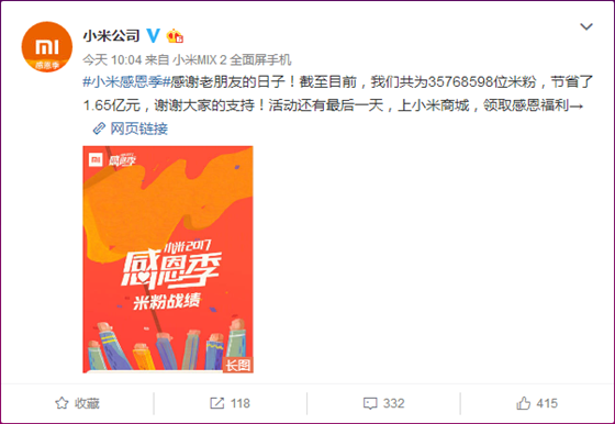 活動還未結束先發戰績!小米2017感恩季已幫米粉節省1.65億元!