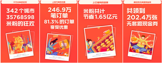 小米給出的數據顯示,12月19日零點至12月25日24點,共有342個城市35,768,598位米粉參加了這次購物狂歡,共成交246.9萬筆訂單,其中享受了優惠的占81.3%(約200.7萬筆);米粉共計節省1.65億元,領到202.4萬張無套路現金券。
