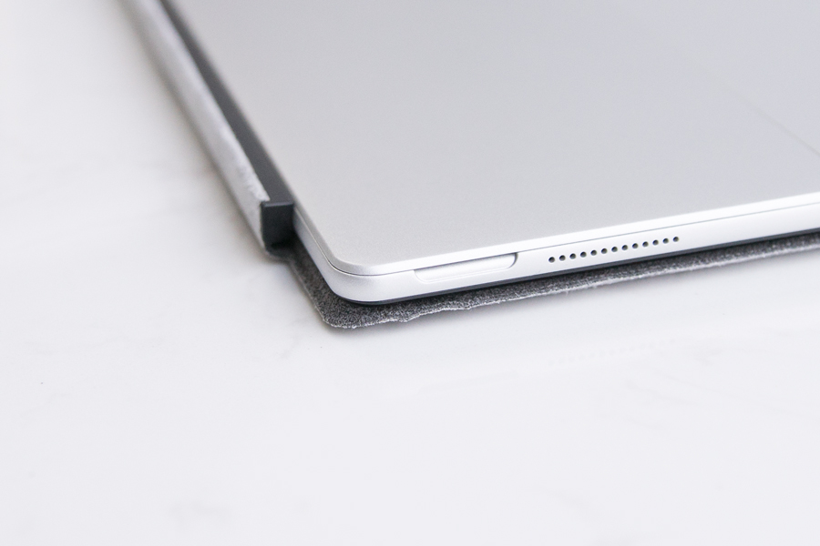 機身左側從上到下分別為3.5mm耳機接口、音量鍵、兩個USB 3.1 Gen1 Type-C連接口、左揚聲器、便于打開支架的凹槽。值得注意的是,充電接口是兩個USB Type-C接口中靠下的那個,電源如果誤接入上方的接口將不會對筆記本進行充電。