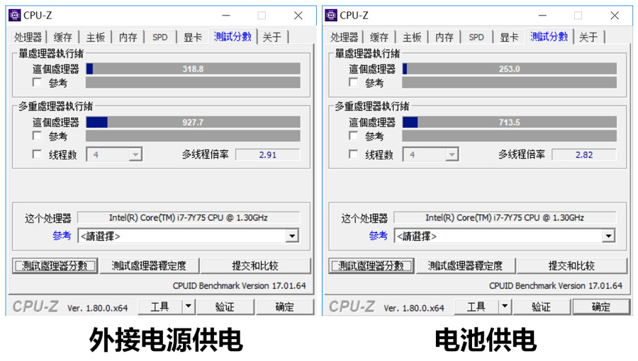 通過CPU-Z軟件測試,外接電源時i7-7Y75處理器的單核得分為318.8分,多核得分927.7分,在移動設備處理器中處于相當高的水平。