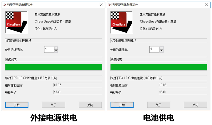 在國際象棋(Fritz Chess Benchmark 4.3.2)軟件的測試中,兩種供電方式得分相差無幾,每秒千步數4830左右。