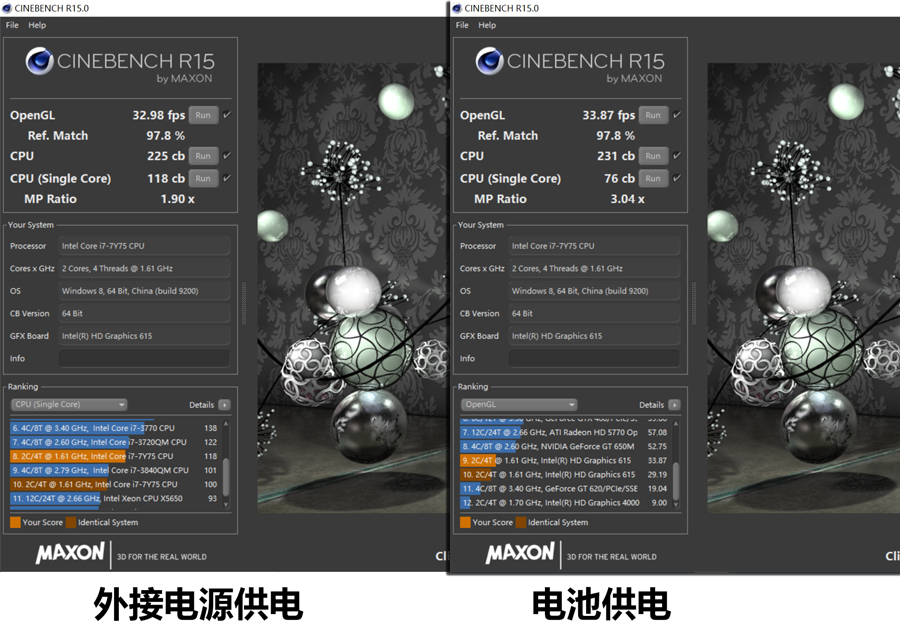 使用CINEBENCH R15進行測試,可以看到是否外接電源對靈越5280在OpenGL部分的影響不大,都能達到33fps左右的成績。CPU部分,電池供電時分數為單核76cb、多核231cb的成績;外接電源時得分為單核118cb、多核225cb,其性能無疑是酷睿Y系列頂尖的了。