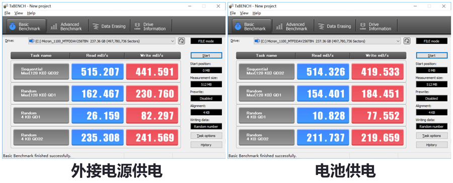 用TxBENCH和CrystalDiskMark對固態硬盤進行測試,成績都比較穩定,515MB/s左右的讀取速度和440MB/s左右的寫入速度,處于SATAⅢ接口固態硬盤的主流水準。