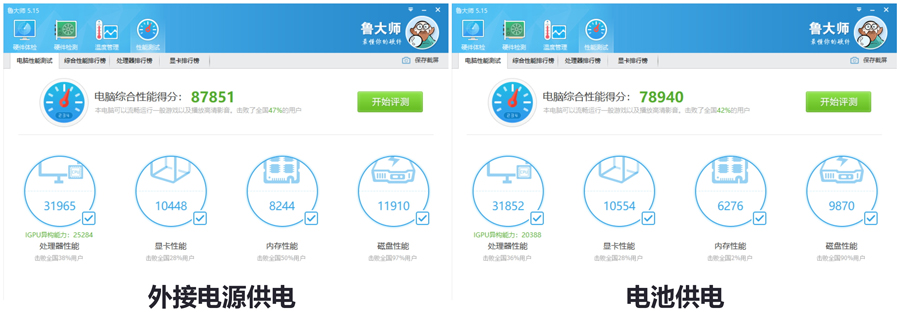 再來對靈越5280進行綜合性能測試,外接電源供電時魯大師測試得分87851分,內置電池供電時魯大師測試得分78940分。