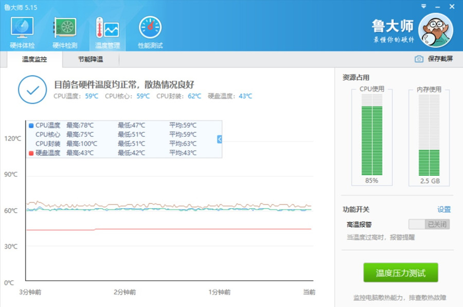 用魯大師進行溫度壓力測試,在連接了電源的情況下CPU持續滿載的溫度穩定在60℃左右,看樣子英特爾對酷睿i7-7Y75發熱的控制還是非常出色的,靠機身背后的大面積金屬自然散熱也已經足夠。
