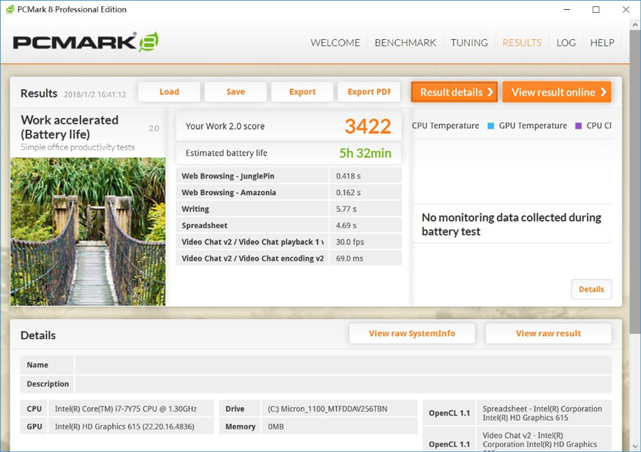 通過PCMark 8的Work模式模擬日常使用環境對靈越5280進行續航測試,屏幕亮度為室內比較舒適的40%,可以看到續航達到了約5小時32分鐘。如果把PCMark 8預留20%電量算進去,靈越5280總體續航將達到6小時以上,這對于一款輕薄本是非常不錯的成績,外出辦公帶上它會是個不錯的選擇。
