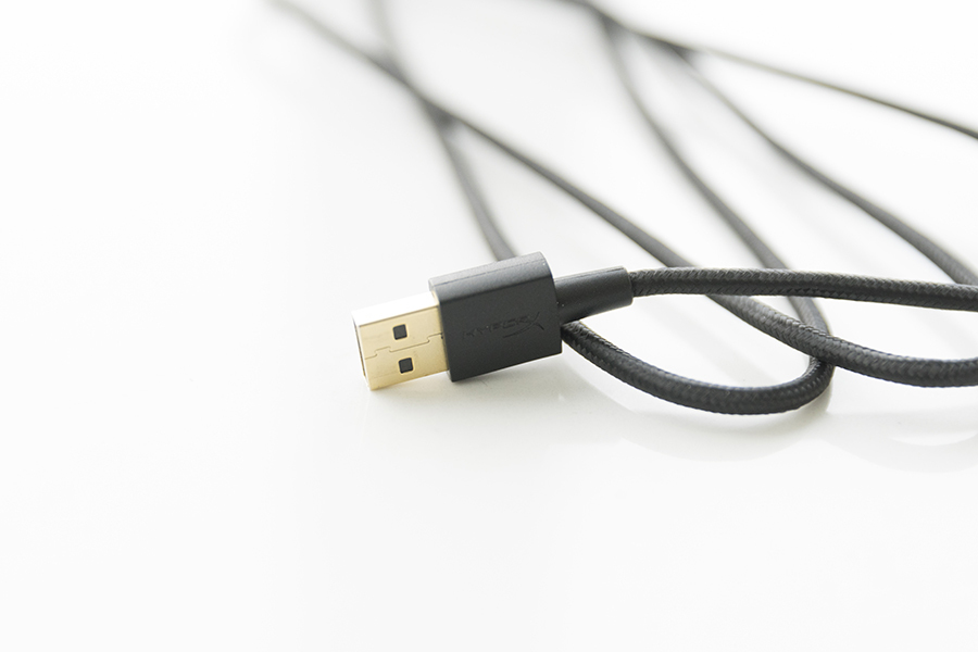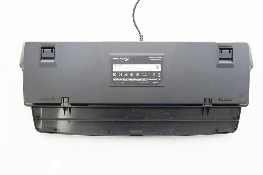 HyperX Mars火星RGB電競機械鍵盤背部整體設計較為簡潔,在鍵盤的背面擁有四塊長條形的防滑腳墊,在附贈的掌托上還有三塊,能夠有效的提高鍵盤放置在桌面時的穩定性。另外還擁有兩個支撐腳架,但僅有一種高度可供調節。鍵盤采用尼龍編織線材,軟硬適中,易于整理不易打結,USB插頭處采用鍍金工藝,能夠有效提高鍵盤的使用壽命。