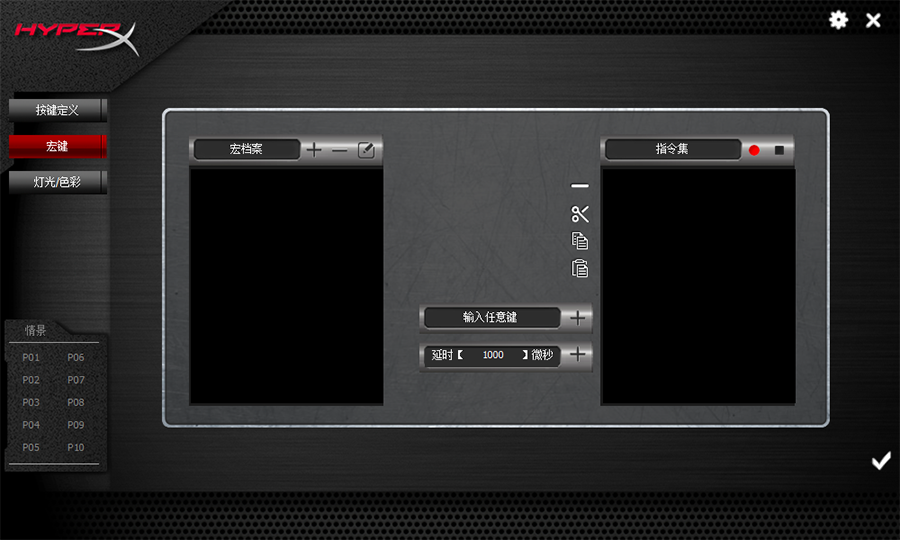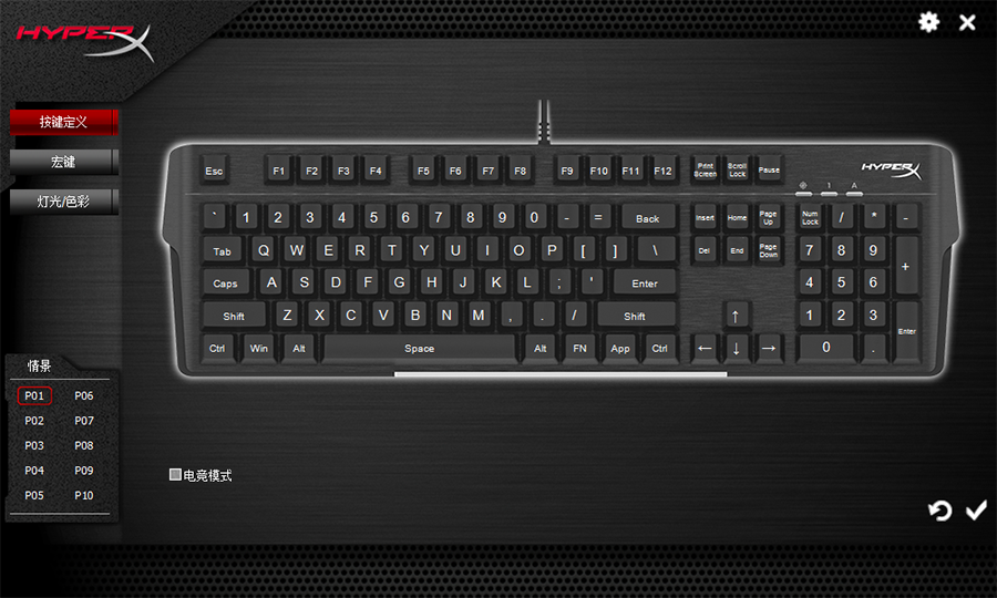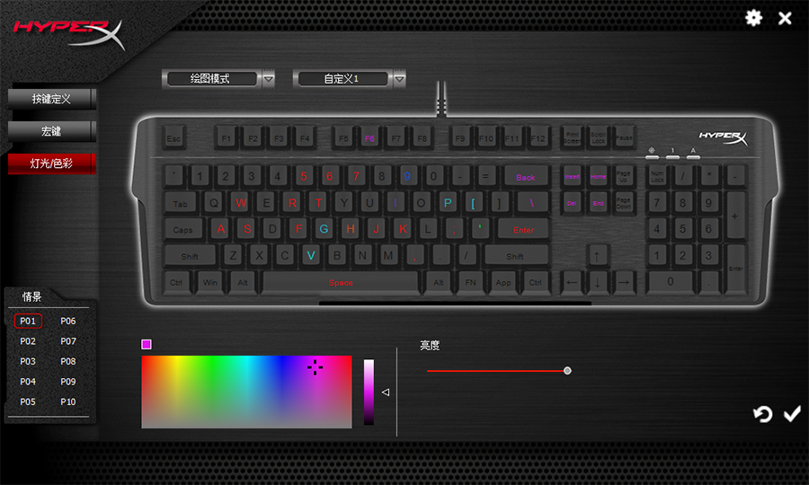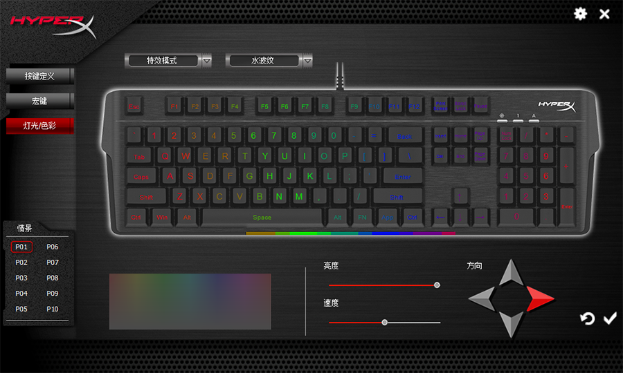 與燈光緊密相連的自然是驅動程序帶來的多種燈光玩法啦,HyperX RGB電競機械鍵盤的驅動除了提供自定義按鍵、宏按鍵設置等功能,在燈光模式下也是下足了功夫。它擁有特效模式和繪圖模式兩種模式可供選擇,特效模式下擁有水波紋、堆疊、靜態、呼吸、光譜循環五種燈效,你還可以調節亮度、速度、方向。而在繪圖模式下,你可以調節單個按鍵的燈光亮度和顏色,可玩性非常高。