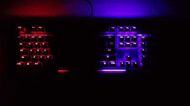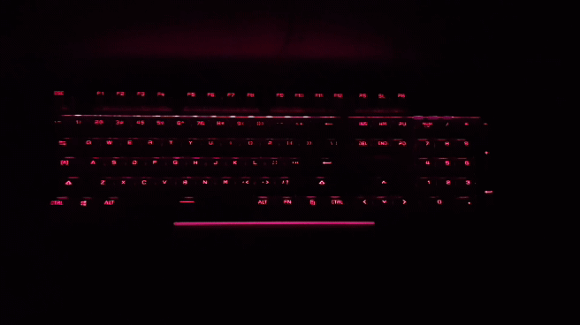 那么既然是RGB電競機械鍵盤,自然是要說一說它的燈光設計了。首先其采用了透明軸體,能夠讓燈光完全從軸蓋中綻放出來,HyperX火星機械鍵盤支持1680萬色背光,可以通過組合快捷鍵調節背光顏色和光效模式。在下邊框處還擁有一條醒目的燈帶,尤其是在晚上顯得格外的耀眼。而在上文中我們提到的那條高光亮面凹槽,在亮燈時經由燈光反射,從亮白的線條變成了彩條,足夠驚喜。