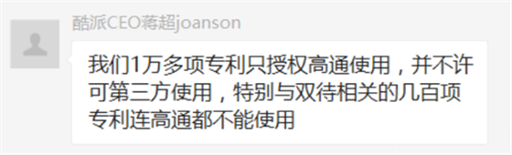 蔣超還透露酷派有1萬多項專利只授權高通使用,并不許可第三方使用,而且其雙待相關的幾百項專利連高通都不能使用。”但是雙待技術現在已經普及,眾多廠商都在使用。