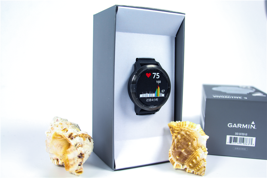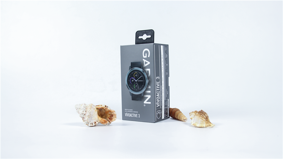 Garmin vívoactive 3的外包裝主色調(diào)為銀灰+白,主打科技運(yùn)動(dòng)風(fēng)。