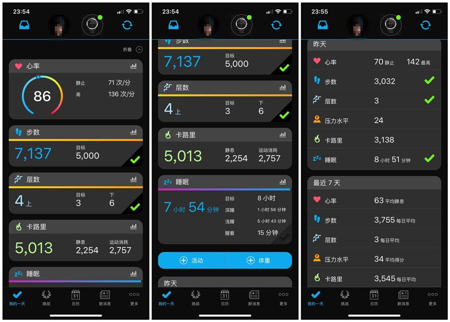 APP的功能相較于手表本身更為齊備,通過(guò)Garmin vívoactive 3自帶的傳感器記錄使用者的運(yùn)動(dòng)數(shù)據(jù)、睡眠時(shí)間、身體參數(shù)。你可以根據(jù)自己的需求隨意增減功能卡片,還能制定挑戰(zhàn)計(jì)劃和專屬的健身日程安排。