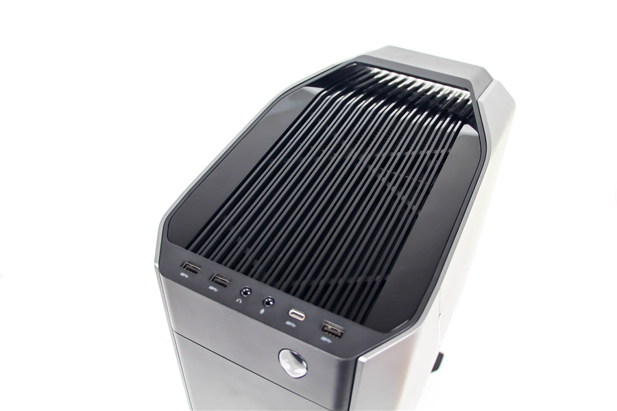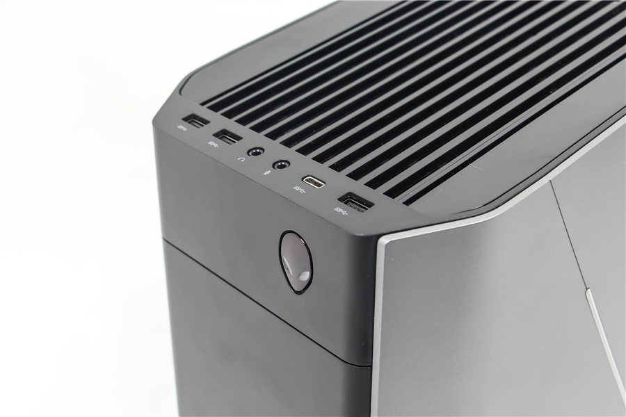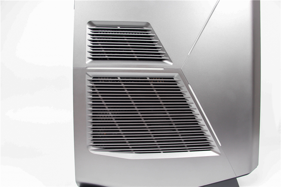 作為Alienware臺式主機(jī)的中堅(jiān)系列,Aurora秉承了近兩代外星人的斜面?zhèn)热乔忻嬖O(shè)計(jì)語言。三枚燈條組成了側(cè)面蓋板的幾何棱線,銀色陽極氧化鋁表面處理工藝凸顯了整機(jī)的工藝質(zhì)感和前衛(wèi)的科技感。正面的黑色格柵看起來中規(guī)中矩,卻用一枚外星人造型的電源開關(guān)畫龍點(diǎn)睛。