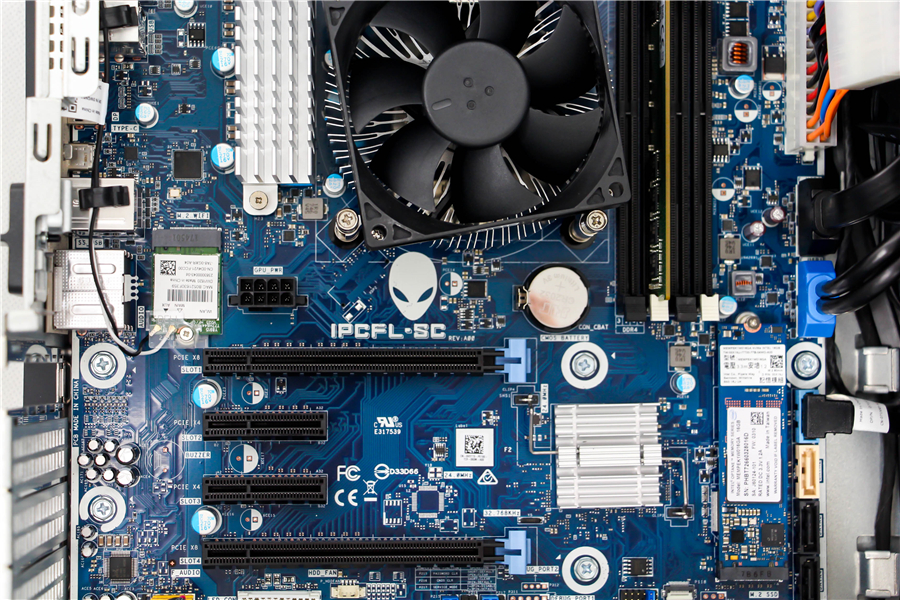 Alienware Aurora R7采用了一塊外星人定制M-ATX主板,采用Intel Z370高速芯片組。主板配備了2+2的PCIe擴(kuò)展槽,2+2雙通道DDR4內(nèi)存插槽,4個SATA接口,擴(kuò)展配置綽綽有余。而機(jī)箱內(nèi)部的空間雖然緊湊,但得益于合理的設(shè)計(jì),依然可以裝下兩張公版尺寸的1080ti顯卡,不可謂不強(qiáng)大。