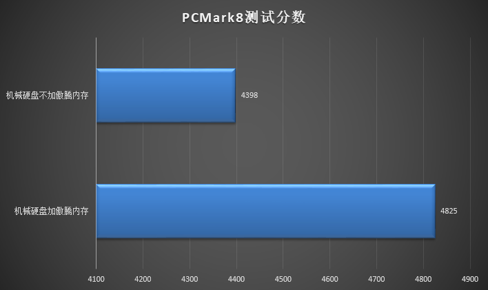 在PCMark8里面,差不多50分一個等級,而如今加裝了傲騰內(nèi)存后分?jǐn)?shù)從4398達(dá)到了4825,增長四百多分。