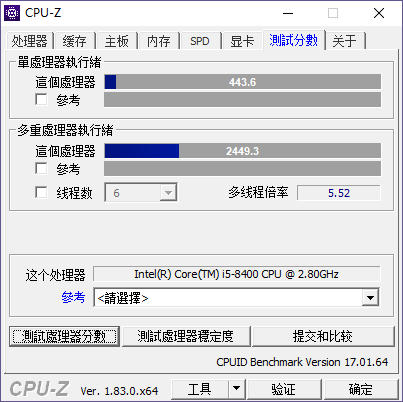 在CPU-Z的測試中,i5 8400單線程得分443.6,多線程得分2449.3,性能處于主流偏上水平。