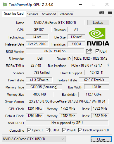 Alienware Aurora R7搭載了GTX 1050ti顯卡,采用GP107核心,顯存位寬128bit,4GB GDDR5顯存,是目前市面上的主流游戲顯卡。