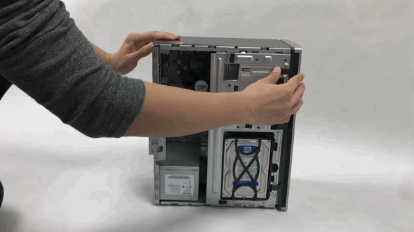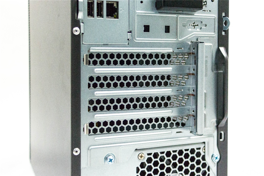 而第四個門則在另一邊。雖然本機并沒有配備獨立顯卡,卻為有需求的用戶預留了升級的空間。四個PCIe位擋板都是可徒手裝卸設計,掀開左側夾扣就可以自如拆裝,非常方便。