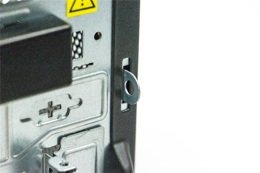 機箱安全的細節設計也很到位。由于只有左側的蓋板可以打開,機箱在蓋板與后面板重合處設計了兩個機箱防盜鎖孔。位于下面的是標準機箱防盜鎖孔,而上面的則被設計成可以使用鎖頭的樣式。雖然“土”得與整機的商務風格不太兼容,但雙重保險卻更令人感到放心。