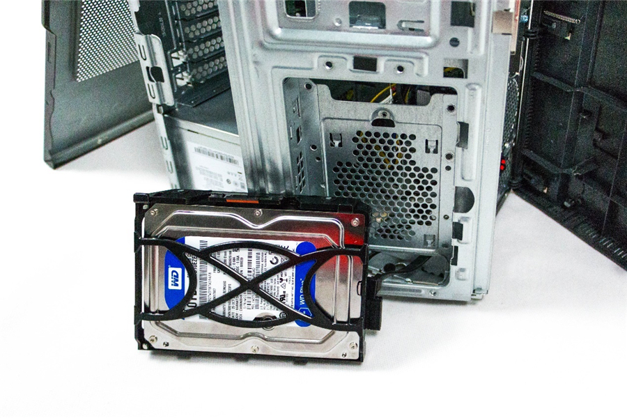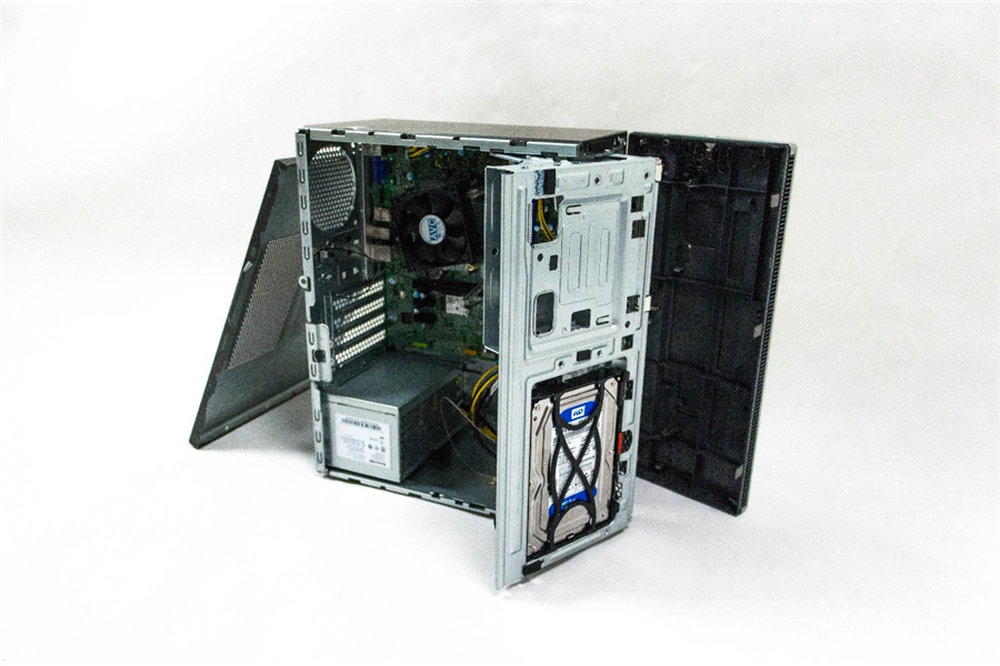 打開左側蓋板后,我們得以窺見其內部結構。主要硬件區、硬盤、電源一目了然,整體感覺簡潔明了。