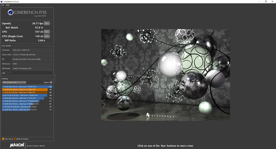 CineBench R15,也就是我們俗稱的數格子。在CineBench R15的測試中,i5-7400多核得分547cb,單核得分149cb。在單核得分上,i5-7400甚至超過了i7-3930k,應付大型游戲都沒問題,更不要說日常辦公了。