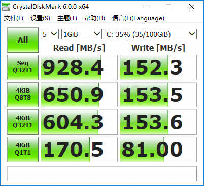 在CrystalDiskMark的測試中,硬盤的持續讀取速度飆升到了928.4MB/s,這一數據超過了絕大多數的家用中小容量SATA SSD。而4K讀寫上的表現更為驚人,這一數據可以說是質的飛躍,在日常使用中能夠帶來巨大的體驗提升。