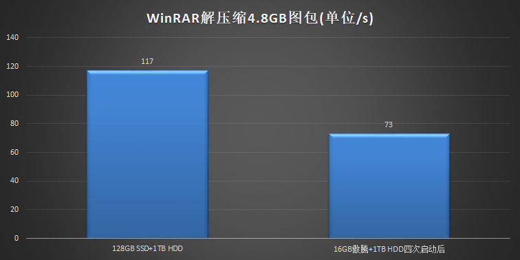 我們將共209張、4.96GB的CR2格式照片壓縮為4.8GB的壓縮包,分別在兩臺PC上解壓縮。在這個測試環節中,傲騰強大的4K讀寫能力發揮了作用,領先了SSD平臺約45秒的時間。