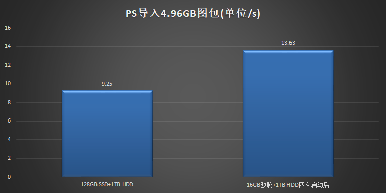 我們將之前解壓縮出的4.96GB圖包整體導入PS,得益于SSD更高的寫入速度,SSD平臺面對傲騰取得了近4.5秒的巨大優勢。