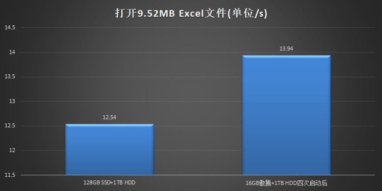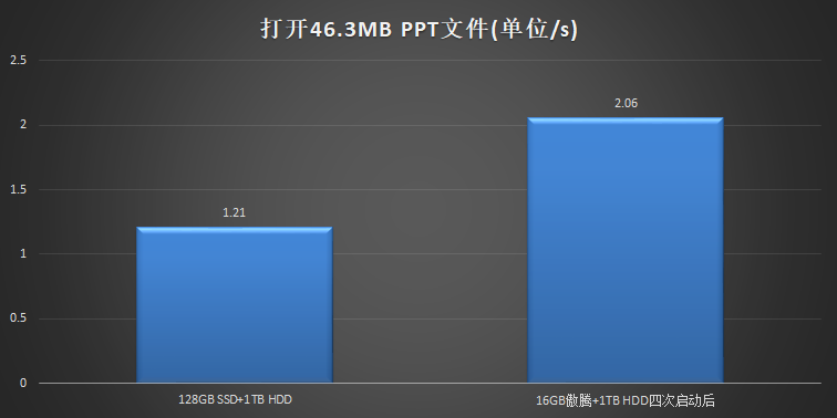 在日常工作中,我們最常用到的Office文件就是Word、Excel以及PPT了。而這三類文件的大文件是比較常見的,也非常地考驗打開速度。我們專門準備了26.8MB大小的Word文件、9.52MB大小的Excel文件、46.3MB大小的PPT文件,進行讀取速度測試。在這輪測試中,傲騰平臺總體表現略遜于SSD平臺,但除了Excel文件,其他的差距都在一秒以內,在實際使用中的體驗差別幾等于無。