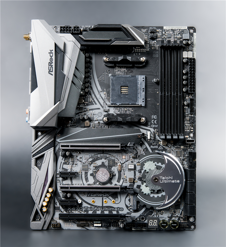 本次采用的是華擎X470 Taichi Ultimate主板。這款主板整體覆蓋了以齒輪為主題的散熱裝甲,復古與現(xiàn)代科技的交融帶來了滿滿的賽博朋克風。主板本身的燈效能與AMD原裝“幽靈”散熱器完美同步,配套天衣無縫。而華擎本身的技術(shù)實力與扎實做工使得這塊主板能夠賦予銳龍二代更大的發(fā)揮余地,華擎“妖板”的諢號是玩家對于這一品牌喜愛的最直觀反映。