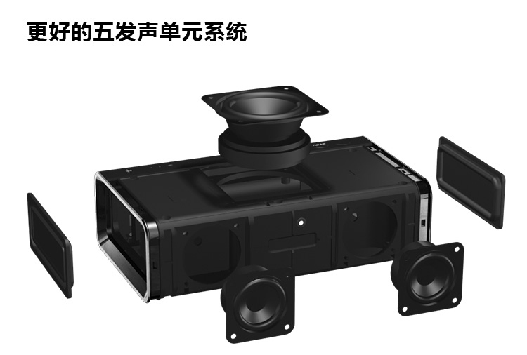 聲霸鑼專業版的外觀采用極簡主義設計,不落俗套。值得一提的是,音箱內置5個揚聲器驅動單元,包括1個頂部的2.5英寸低音炮,能帶來震撼且驚人的中音和低音表現。位于音箱左右兩側的低頻共振膜能使高、中、低音的表現更上一層樓。通過調整低音炮的位置,音箱在播放時將更加穩定。