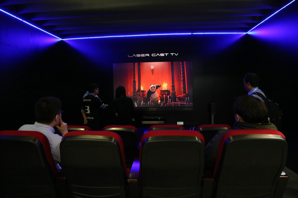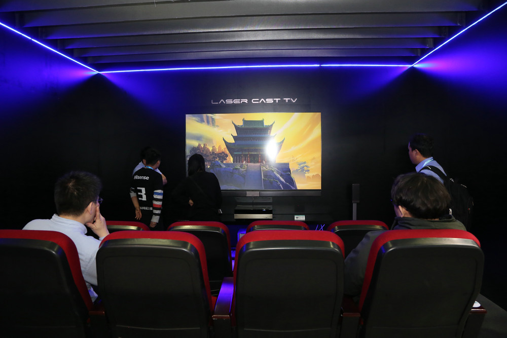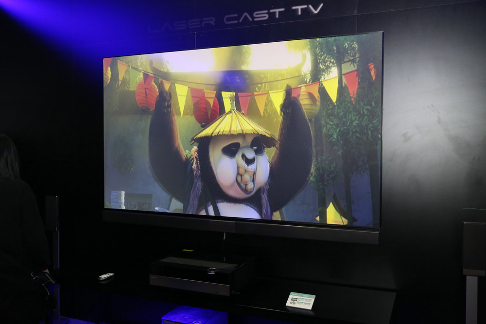 除此之外,現(xiàn)場還展出了海信所推出的100英寸激光電視,其采用了完全無需電量供給的無源光學幕+主機+音響的三合一形式,激光投射是最大的亮點。據(jù)介紹,其采用遠心結構光路設計,支持HDR技術,不僅能在短距離內(nèi)投射出百寸以上畫面,而且標稱色域達到了116%,比普通電視色彩更豐富、畫面更真實。